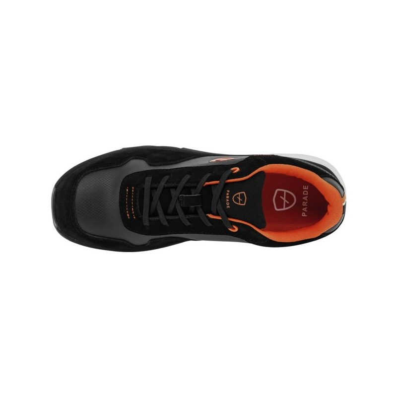 Tige en microfibre et croute de cuir, hydrofuge. Doublure en textile. Première de propreté anatomique et amovible en maille sur mousse PU. Semelle d'usure en caoutchouc / EVA. Semelle antiperforation textile. Embout de sécurité en composite. Poids : 558 g Coloris : noir/orange Pointures : 35 au 48 Norme : CE Cat II - EN ISO 20345 - S3 HRO SRC