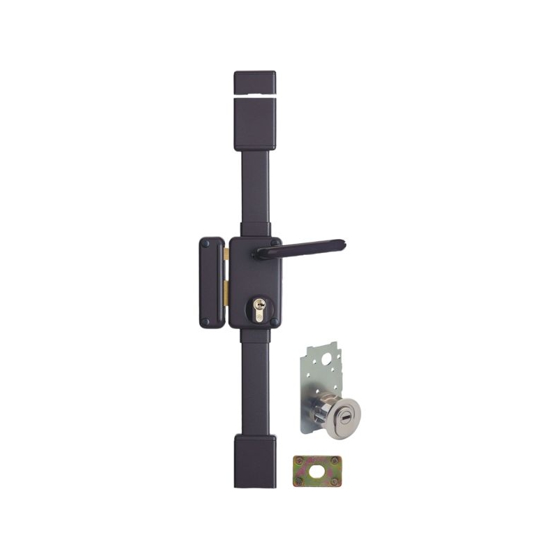 Pêne dormant renforcé par 2 goupilles en acier trempé. Cabochon en acier de protection contre l'arrachage du cylindre. Plaque de blindage en acier cémenté. 2 goupilles de protection du cylindre contre le perçage. Boîtier acier embouti 20/10e. Pour porte de 1650 à 2250 mm. Rappel équerre du ½ tour. Pênes haut et bas en acier Ø 16 mm, tringles ajustables. Béquille intérieure. Livré avec gâche, avec cylindre Transit 2 dim. 30 x 65 mm (pour porte épaisseur 45 mm) + 4 clés. Existe aussi en blanc, nous consulter. Coffre : 75 x 130 mm Axe : 45 mm Entraxe : 70 mm Fouillot carré : 7 mm Finition : époxy marron Conditionnement : boite