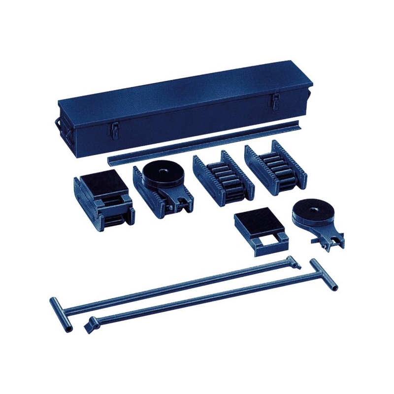 Pour le déplacement manuel de fortes charges (machines-outils, ponts, portes de hangars...). Composé de : - 4 rouleurs, - 2 cales, - 2 plateaux tournants, - 2 timons, - 2 cornières d'accouplement. Vitesse de déplacement maxi : 5 m/mn Charge maxi par rouleur : 10 t Charge maxi du coffret : 20 t Poids coffret : 55 kg 60% recyclable