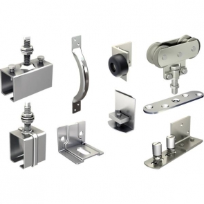Pour porte de 80 kg. Montage sans profil U, guide bas 2 olives. Composée de : - 2 montures 02350235D avec 2 galets en nylon montés sur cage à rouleaux, - 2 platines 0036, - 5 (code 53697) ou 7 (code 53698) supports enveloppants 3531, - 1 support manchon 3531 MC (uniquement pour le code 53698), - 5 (code 53697) ou 8 (code 53698) pattes équerre 3533, - 2 enjoliveurs 3540, - 1 guide du bas à visser 1092V25, - 2 butées 1086, - 1 poignée 1298. Conditionnement : boîte