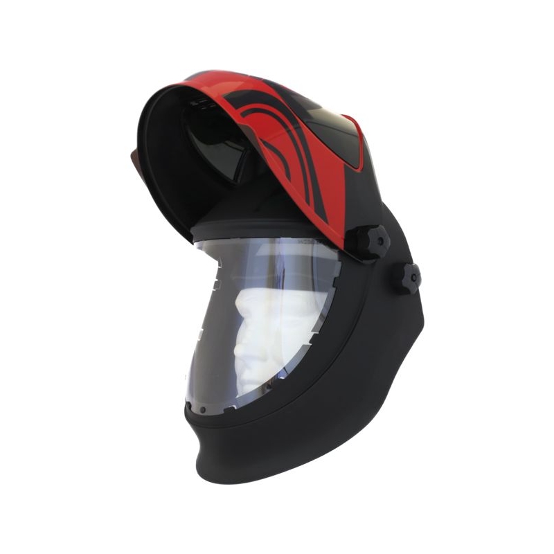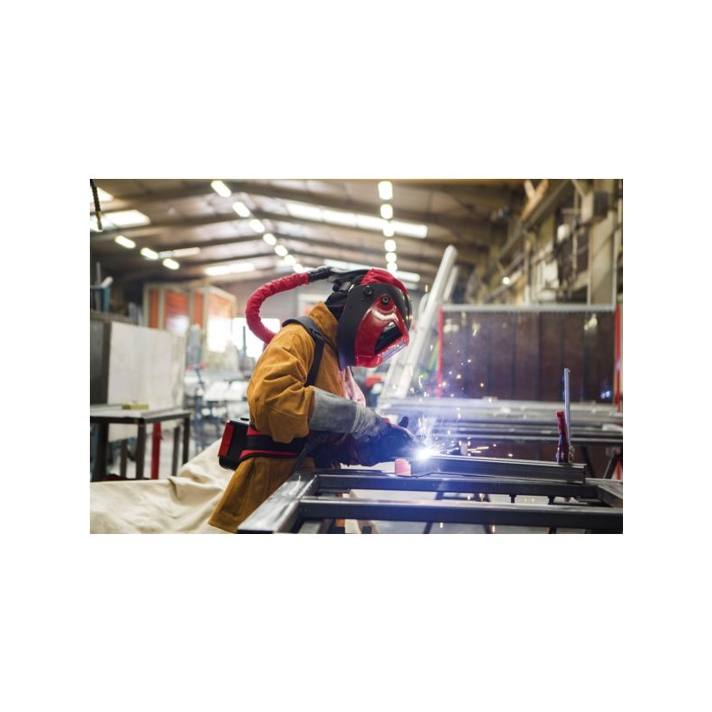 Masque combine une cellule électronique 4 capteurs adaptée au soudage à l’arc, MIG/MAG et TIG et une large visière incolore pour les applications de meulage. Teinte Variable DIN 9 à DIN 13. Vision latérale 160°. Classes optiques : 1/1/1/2 Temps de réaction : 0,2 ms Champ de vision : 93 x 43 mm Poids : 581 g Norme : CE Cat II - EN 379 - EN 175 Appareil à ventilation assistée Airkos® : Filtre classé « réutilisable » (PRSL), pas d’obligation d’être remplacé à chaque poste. Alarme sonore et visuelle de colmatage du filtre. Livré avec une batterie Lithium-ion rechargeable à 4 cellules, une large ceinture matelassée assurant un maintien et un confort parfait et d'un sac de rangement. Coloris : rouge et noir Filtre : TH2PSL Norme : CE Cat II - EN 12941