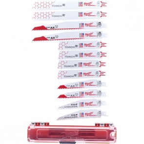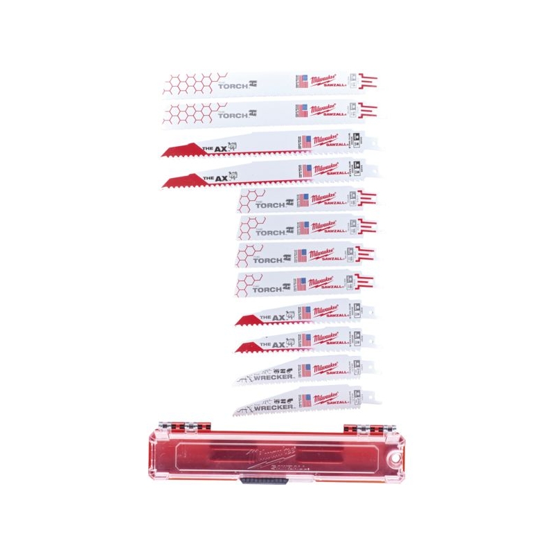 Composé de : - 2 lames AX bois avec clous 150 mm x 5 Tpi, 48005021 - 2 lames AX bois avec clous 230 mm x 5 Tpi, 48005026 - 4 lames TORCH métal 150 mm x 18 Tpi, 48005784 - 2 lames TORCH métal 230 mm x 14 Tpi, 48005787 - 2 lames WRECKER multimatériaux 150 mm x 7/11 Tpi, 48005701