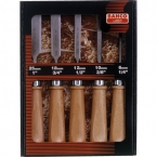 Lame en acier avec collet fuselé. Angle de coupe 25°. Manche en hêtre. Longueur de la lame : 140 mm Largeur : 6 - 10 - 12 - 18 - 25 mm